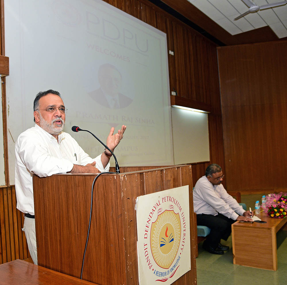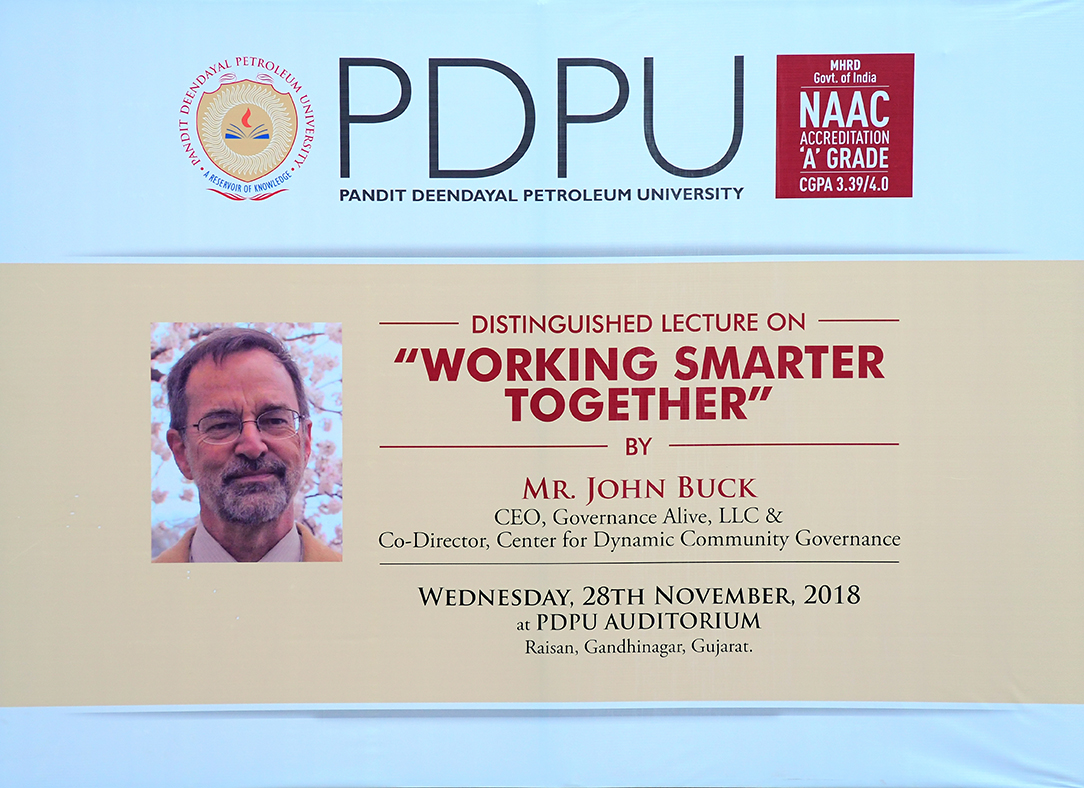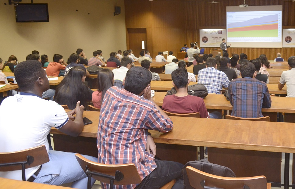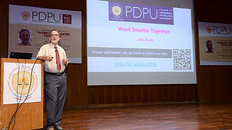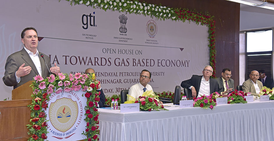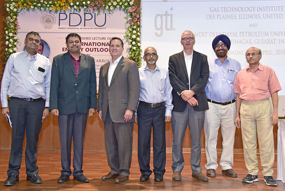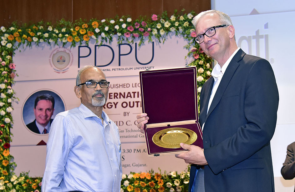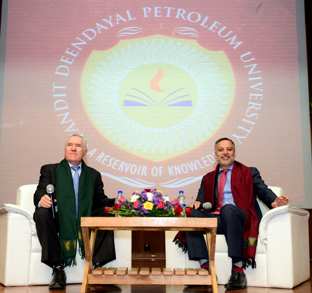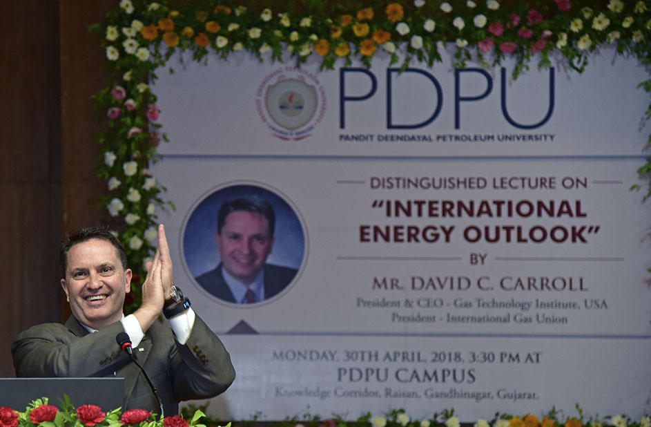 The discussion revolved around India’s target of improving 6% gas in energy mix at present to 15% by 2022. Mr. Carroll in his talk mentioned about his meeting with Prime Minister of India and his request to him regarding collaboration with PDPU. He emphasized the need of renewable energy and new energy such as Coal Bed Methane and Shale Gas.
