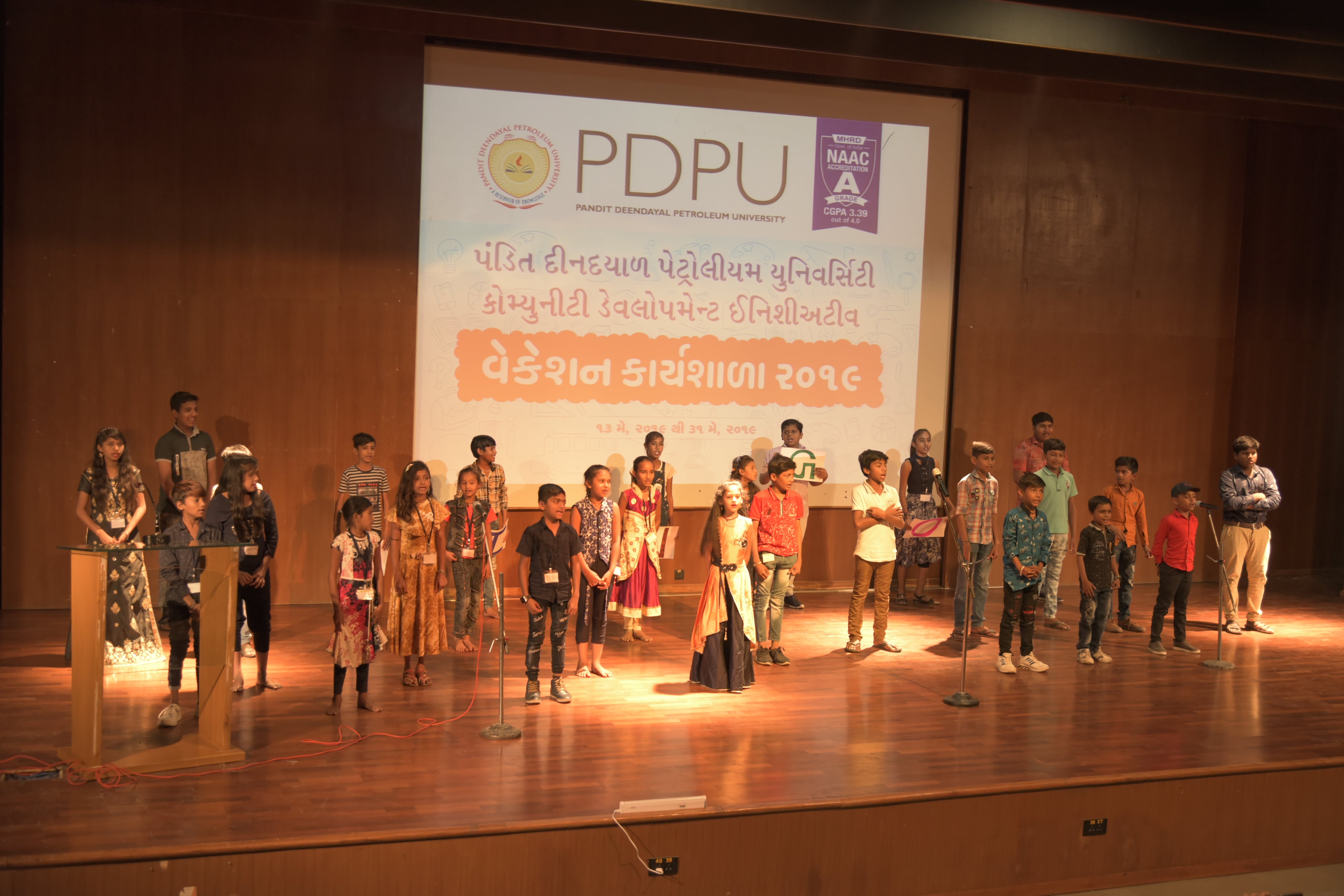 Office of Student Activities, Involvement and Leadership (OSAIL), PDEU organizes Vacation Workshops under Community Development Initiative (CDI) in every year. In its 9th edition in 2018, the programme included workshops such as Terracotta, Spoken English, Folk Dance, Art and Craft, Computer, Mehndi and Drama.